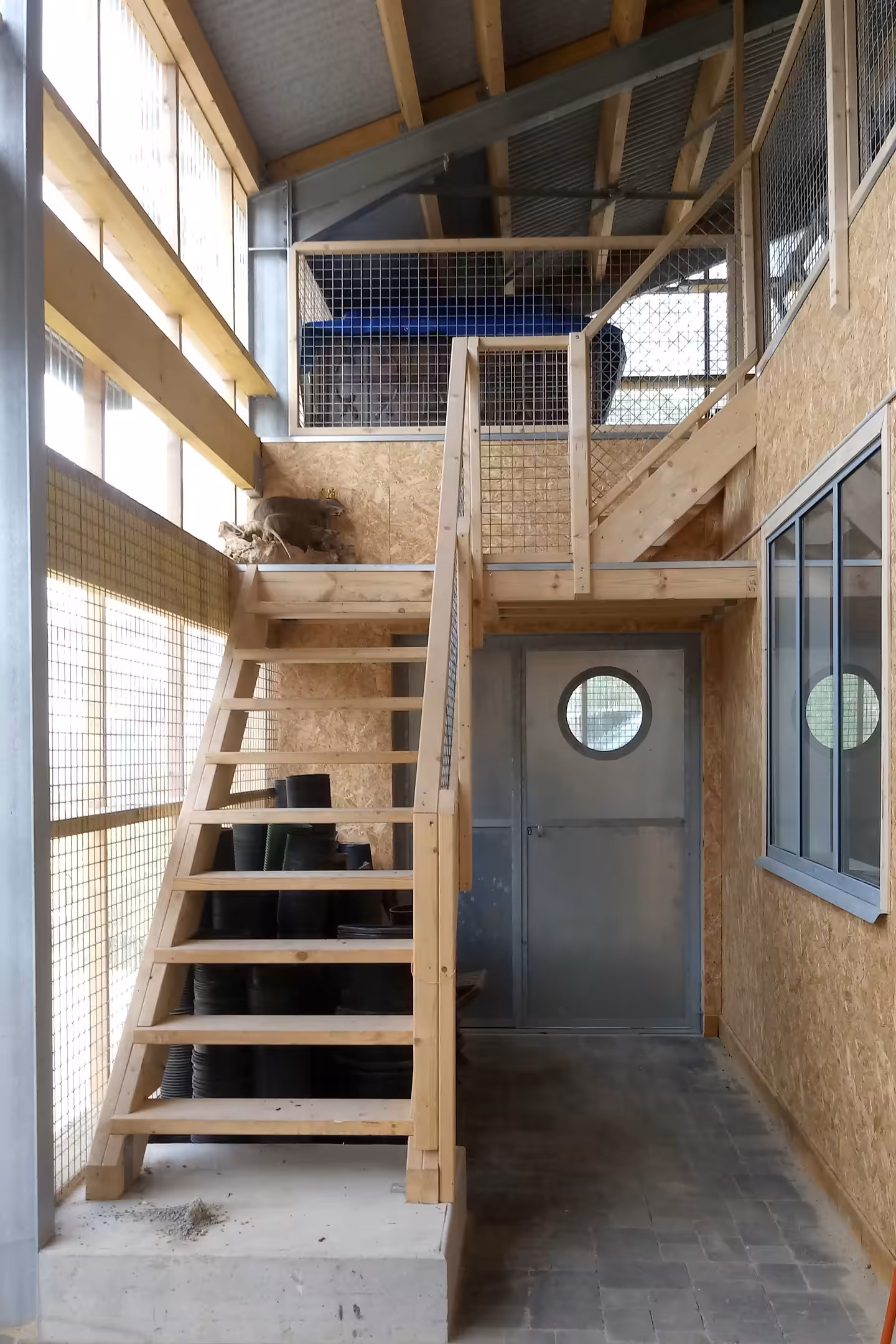 Nous avons procédé à la découpe de tous les montants verticaux pour permettre l’insertion d’un mur de sous-bassement. Également, nous avons effectué plusieurs ajouts de portiques en acier galvanisé pour la reprise de charge. Les poteaux qui préexistaient ont été renforcés par nos soins.